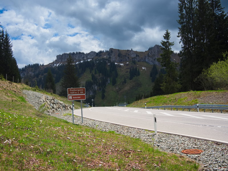 Ik ging verder en fietste het dorpje Oberjoch snel voorbij: gewoon een doodordinair skidorp. Hierna was het nog een kleine kilometer voor ik op de daadwerkelijke pashoogte was. Hier stond geen pas-bord, maar de uitzichten waren al wel grandioos. Inmiddels was het ook nog maar weinig meters naar de grens met Oostenrijk, en in de korte afdaling was het nu eigenlijk vooral genieten.