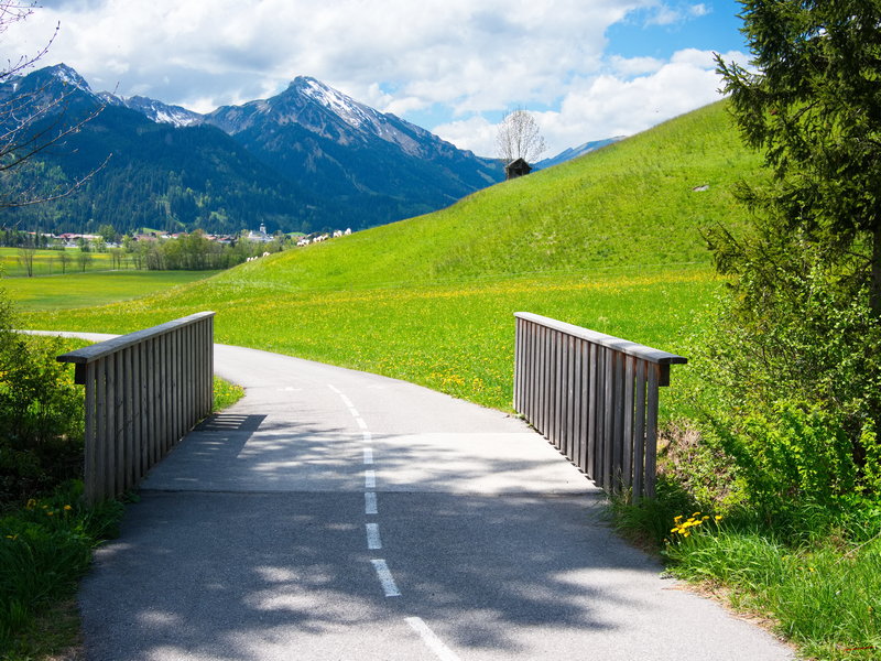 Ik bleef een poosje door een schitterend Oostenrijks hoogdal fietsen: het Tannheimertal. Hier fietste ik over hele fijne prettige fietspaden langs een riviertje en mooie grasvelden, met links en rechts van me indrukwekkende hoge Alpen-bergen.