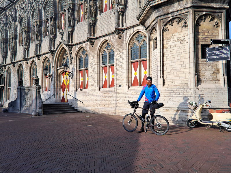 Gestaag fietsend ging het nu langs de Westerschelde richting het eerste checkpoint, een restaurant langs de dijk. Hier was een selfie voldoende, en vervolgens ging het door richting de markt in Middelburg; waar het tijd was voor een kleine snack om de beginnende trek te onderdrukken. Ook hier weer een foto’tje gemaakt bij het checkpoint, en weer door.