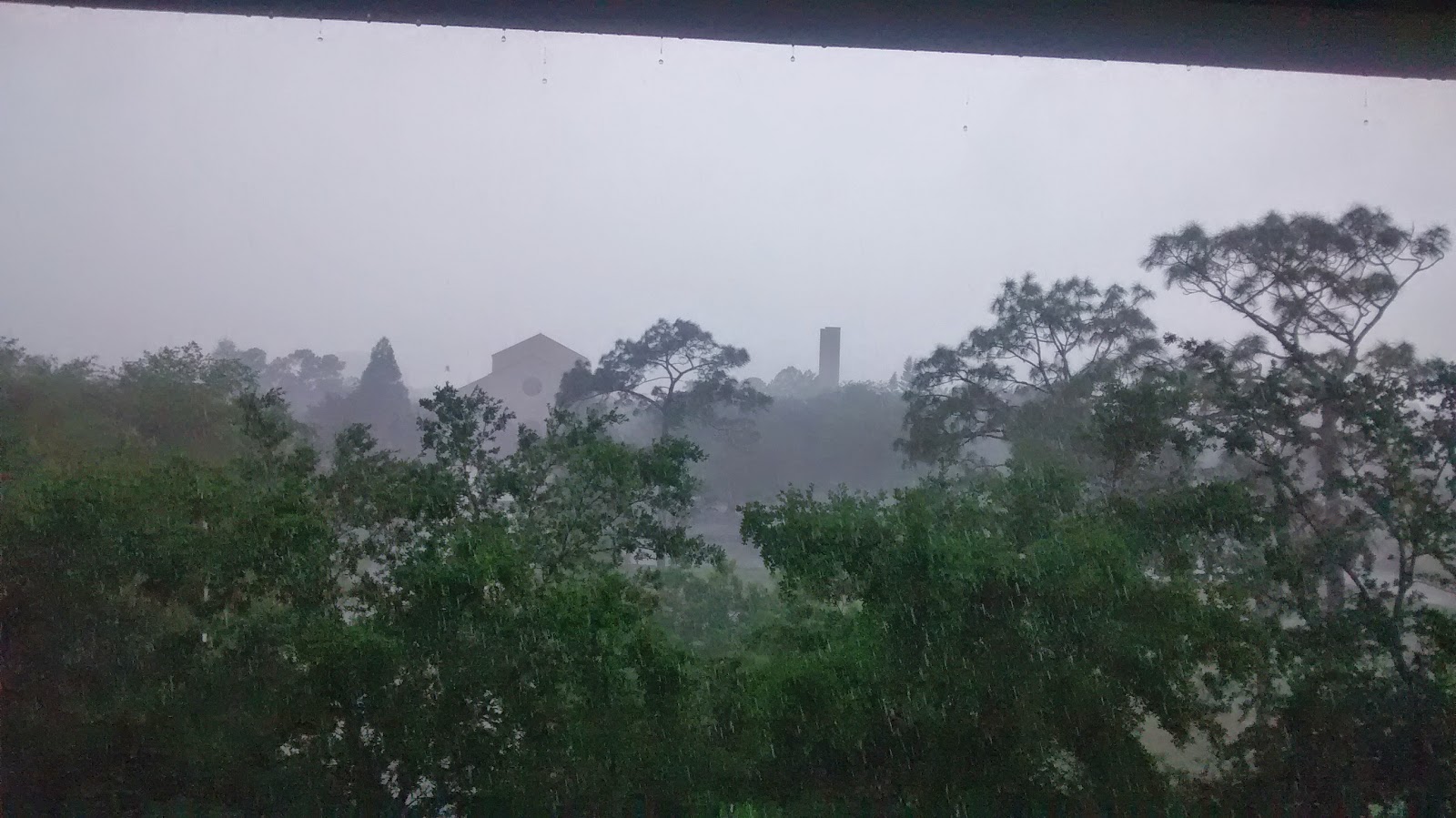 Uitzicht vanuit de parkeergarage tijdens een flinke stortbui. |