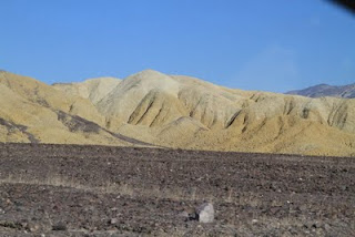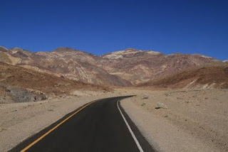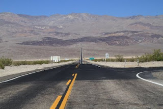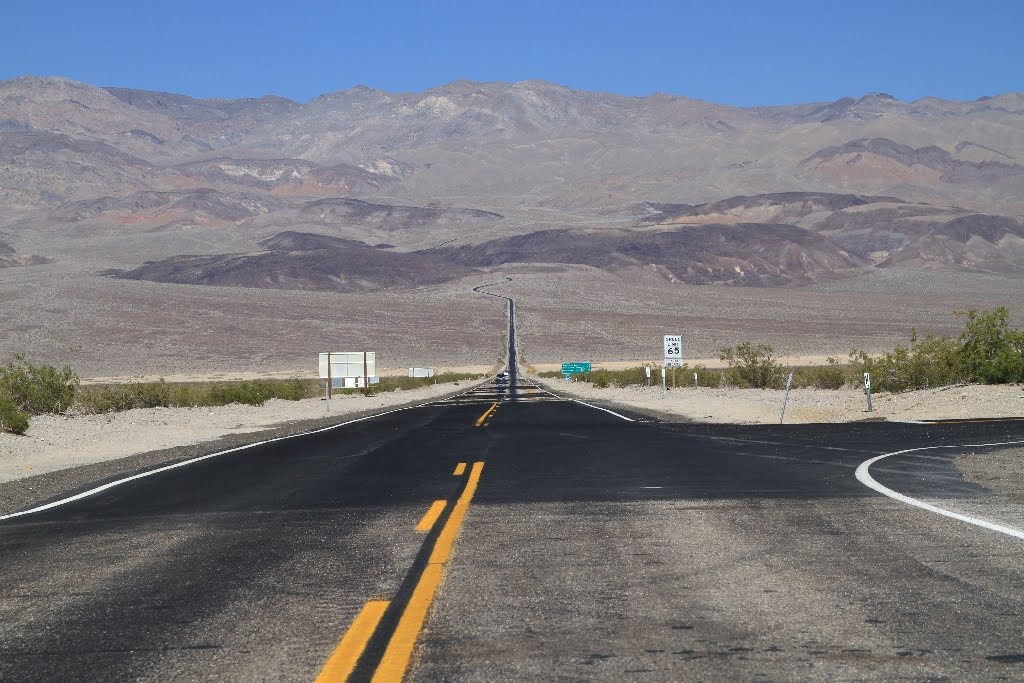 Wat je in Death Valley ziet, is echt indrukwekkend. Bergen afgewisseld met hele platte vlakten, zoals hieronder te zien is en het enige teken van mensenleven is de weg die er dwars doorheen gaat. In het dal dat je in de verte ziet, was het overigens iets meer dan 46 graden.