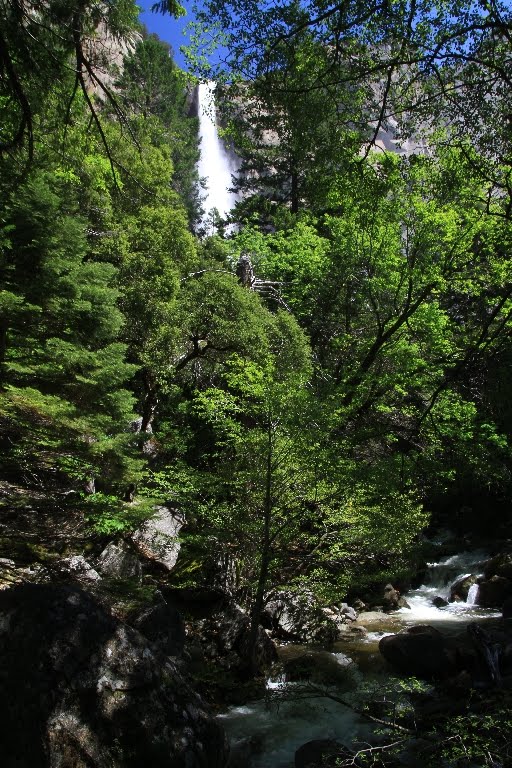 Onderstaande foto’s tonen de zogenaamde ‘bridalveil’ (bruidssluier) waterval. Als je wilde kon je er vlak bij in de buurt komen. Mensen kwamen er compleet doorweekt vandaan. Alhoewel de temperatuur dat wel toeliet (het was een graad of 32), hebben we het toch maar niet gedaan.