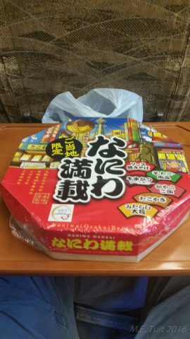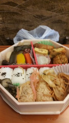 Ondertussen was het al over elven en ik had nog steeds niks gegeten, dus besloot ik me maar een bentobox aan te schaffen. ik moet eerlijk zeggen dat ik deze box alleen maar op basis van de kleurtjes heb gekocht, want van geen enkele box kon ik de inhoud identificeren. Zodra ik in de trein zat ben ik hier gelijk mee begonnen, en het smaakte op zich prima, ook al hadden sommige gerechten imo warm moeten zijn ipv koud.