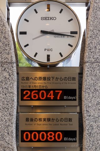 Bij de ingang staat een klok met een tweetal tellers: 1 met het aantal dagen sinds de bom op Hiroshima en 1 sinds de laatst uitgevoerde nucleaire test. Helaas moeten ze die laatste nog steeds resetten…