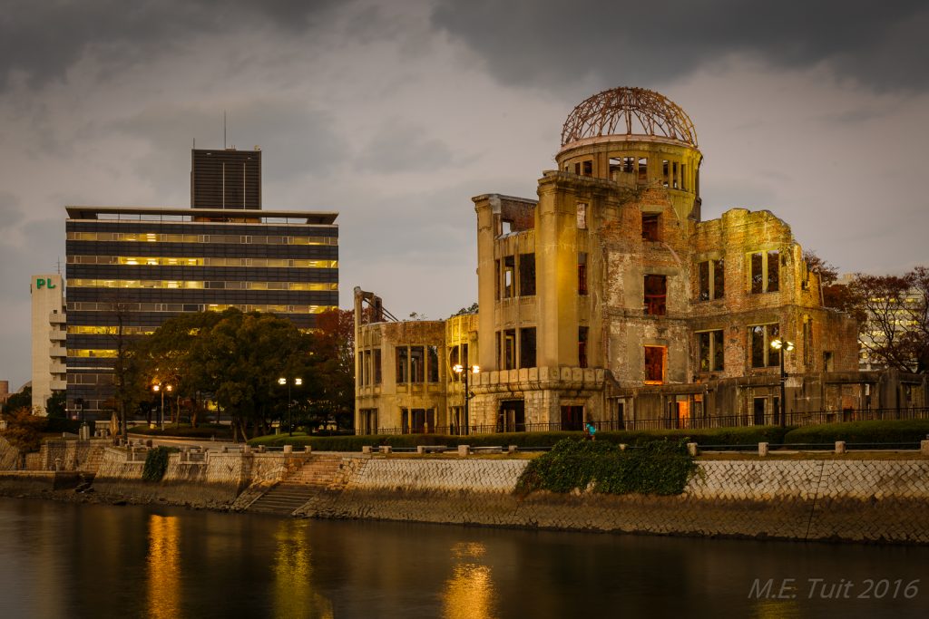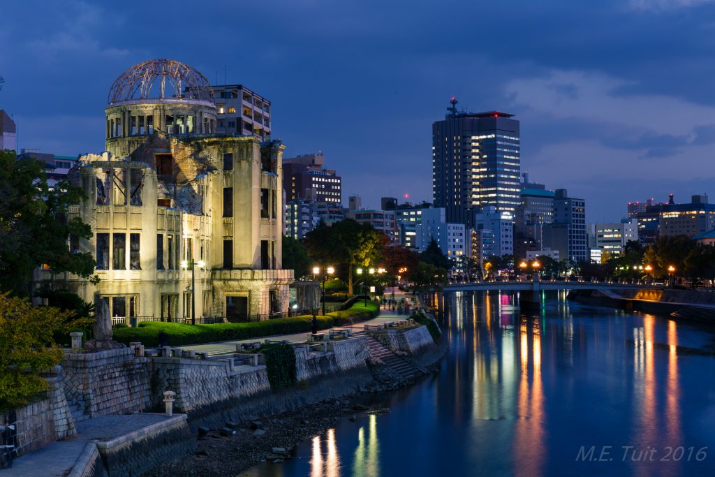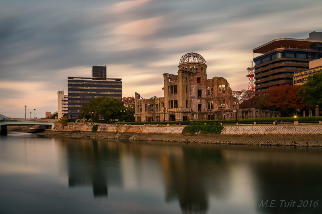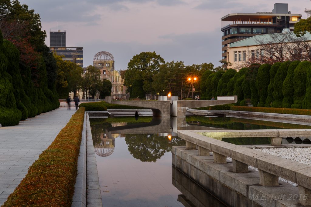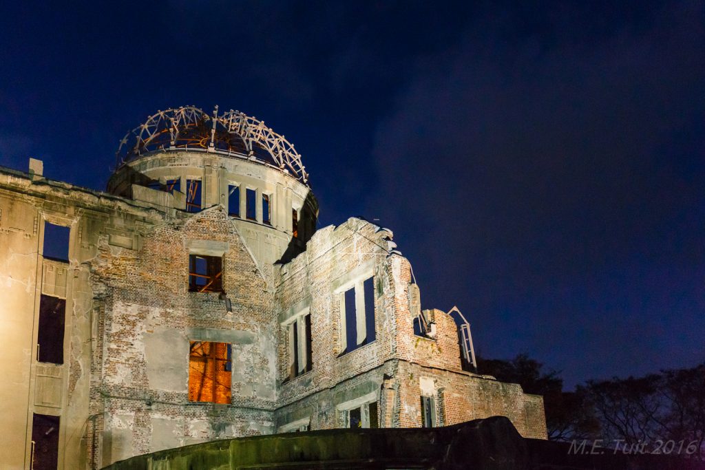 Er waren slechts een aantal gebouwen dat overeind blijf tijdens de bom, en de a-bomb dome is er eentje van. Dit gebouw hebben ze niet gesloopt, en het maakt nu deel uit van het vredespark. Hier heb ik met de schemering nog wat rondgelopen om foto’s te maken, waarna ik via een restaurant weer terug kwam bij het hotel.