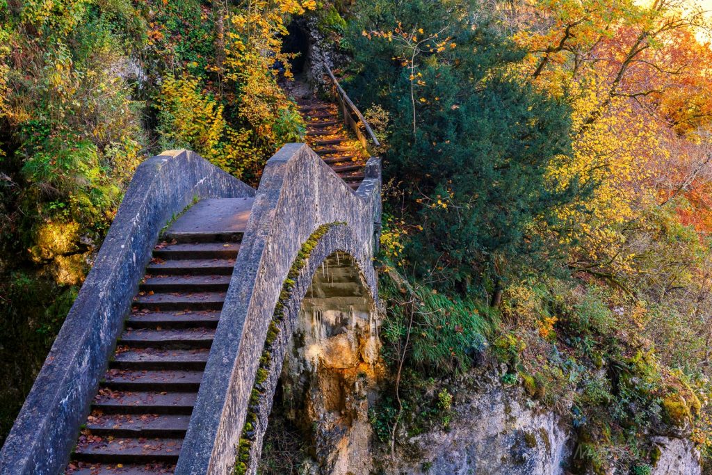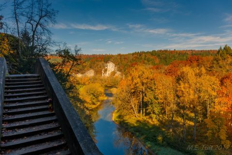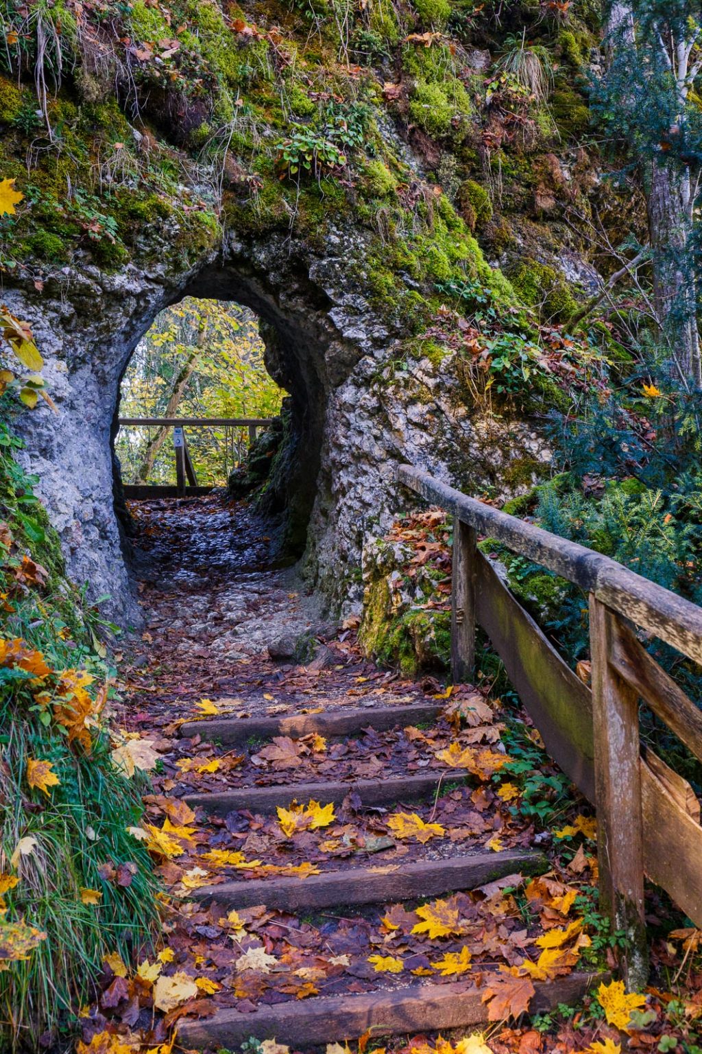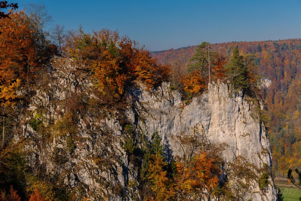 Pas bij het dorpje Neidingen wordt het hogerop gezocht en stijg je richting de 800 meter hoogte. Op sommige stukken loop je zelfs op trappen die in de rotsen zijn vastgemaakt.
