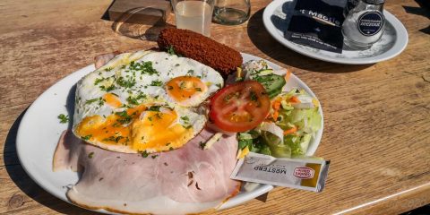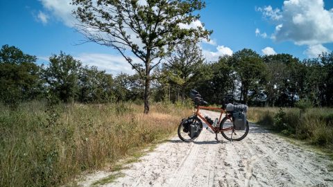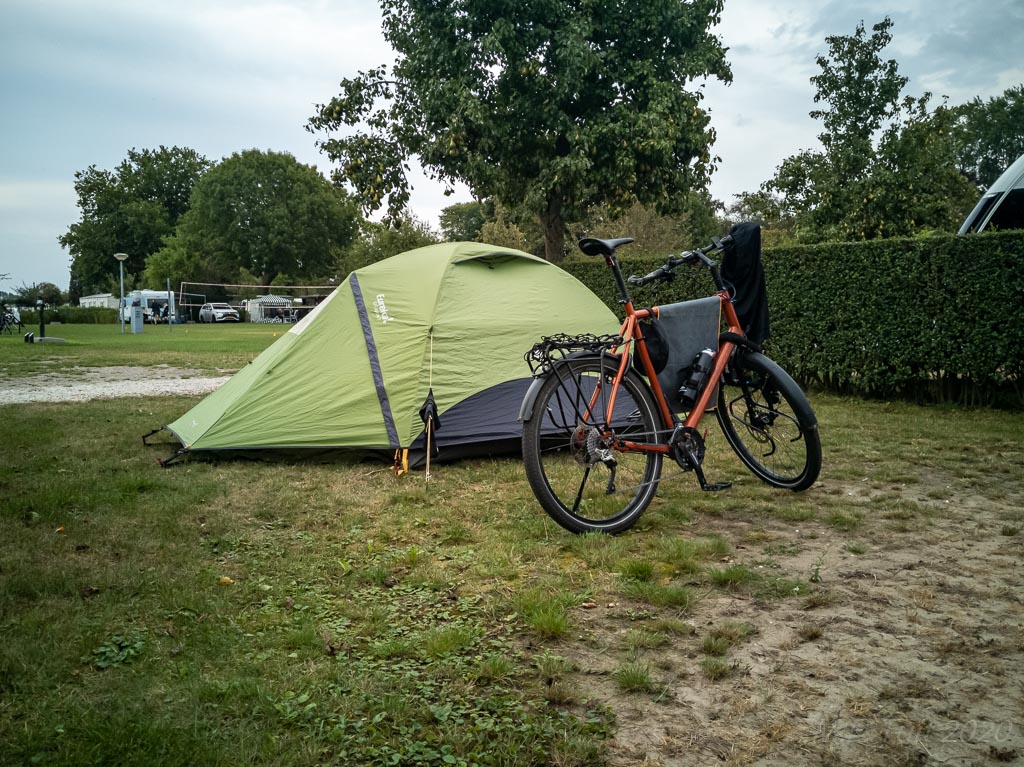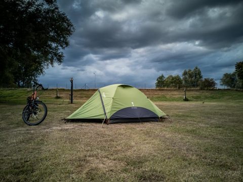 Tot aan Zaltbommel volg ik een niet heel spectaculaire route, al zal het ook meespelen dat het een grijze dag is en eigenlijk ook met redelijk frisse wind. Ik rijd langs de A15 richting Gorinchem om daar de Waal over te steken. Hier gaat het onder andere via Woudrichem en de Maas richting Zaltbommel waar ik via de brug van de A2 de daadwerkelijke route oppik. Na oversteken van de Waal gaat het nog voor zo’n kleine 20 kilometer langs de uiterwaarden van de rivier richting Zennewijnen, waar ik op Camping Zennewijnen de tent neerzet. Hier heb ik nog op het terras patat, frikadel en Brugse Zot naar binnen geslagen. Er waren namelijk geen winkels meer op ‘acceptabele’ fiets- en/of loopafstand. Voor de rest van de middag en avond heb ik vooral uitgerust, ik moet namelijk nog 30 dagen 😉