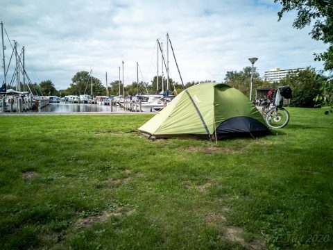 Eenmaal aangekomen in Sneek ging ik snel richting de jachthaven die ook een camping is: de Domp. Bij aankomst bleek dit de duurste camping tot nu toe, maar ook gelijk degene met de mooiste grasmat en het mooiste sanitair. Tevens was er geen sprake van vervallen stacaravans. Na alles neergezet te hebben nog even gesproken met twee jonge Duitse zeilers, die een rondje door Noord-Nederland aan het zeilen waren. Ze stonden met hun tentje naast me, want hun bootje was te klein om in te slapen 🙂