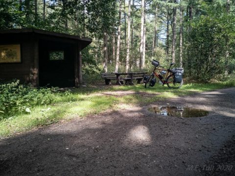 Al met al best een fijne dag gehad, al zat ik er uiteindelijk wel een beetje doorheen. Ik moet zeggen dat de koude stortbui bij het Thulsfelder stuwmeer ook niet hielp. Verder had ik mijn eten niet helemaal goed ingedeeld qua timing. Ik maakte me te druk om of ik wel een plaatsje kon krijgen op de camping aangezien dit de laatste camping voor de komende 60 kilometer is… Gelukkig was die vrees onterecht, want plek was er meer dan genoeg op camping Aschenbeck bij Dötlingen. En ook deze was niet duur, 9,50 euro. Wel meer waar voor je geld dan de camping van gisteren met een mooi tentenveldje…