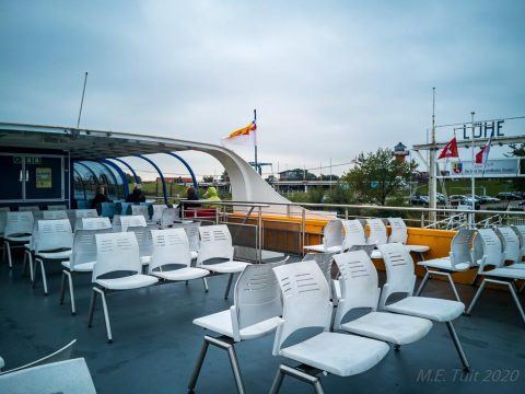 Vandaag zou ik weer van de officiële route afwijken, en een variant richting Lübeck pakken die korter is. Deze route begint aan de rivier de Elbe, bij het veer van Grunendeich. Ik wilde perse het veer van 10 uur halen, omdat anders de volgende pas weer om 12 uur zou gaan, en dat vond ik te laat. Gelukkig was ik precies op tijd, en na aftikken van 7,50 euro zocht ik een plekje op het buitendek.