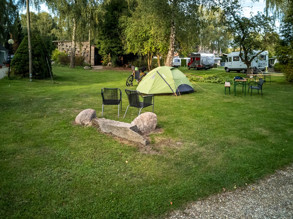 Gelukkig kwam het uiteindelijk toch goed, en het duurde niet lang meer voor ik de route weer opgepikt had. Hierna gebeurde het nog een aantal malen dat de GPS-track afweek van de markeringen. Nu bleef ik de markeringen echter volgen, behalve vlakbij het plaatsje Gartow, want daar wilde ik op een camping gaan staan. Daar aangekomen bleek het vrij druk op de camping met campers en caravans, maar het tentenveld was vrij leeg. Uiteindelijk stonden we met 5 fietsers op het hele veld, wat een ruimte! 1000x liever dat dan bumper aan bumper met de camper 🙂