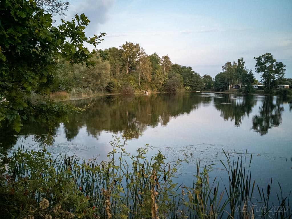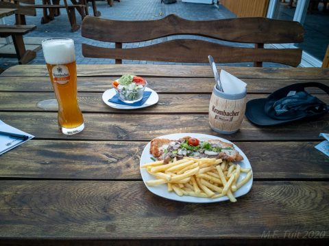 Uiteindelijk kwam ik dan toch aan op de camping Seecamp Derneburg, waar ik een plekje met uitzicht over een algenmeer kreeg. Ik had geen zin meer om boodschappen te doen, of om zelf iets te fabriceren, dus ik besloot maar bij het restaurant te gaan eten. Smaakte prima, die förster schnitzel met roomsaus en weizen om het weg te spoelen. 🙂