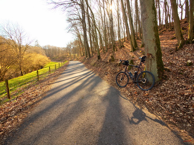 Gelijk na bij mijn verblijf rechtsaf te zijn geslagen mag ik na een korte daling naar de Roer om die over te steken flink gaan klimmen over een hele rustige bosweg. Een erg mooi begin van de route, want de weg is verboden voor autoverkeer, op boswerkers na. Erg lekker fietsen zo, en de klim viel alleszins mee. Ik had hier een beetje tegenop gezien, doordat het voor het eerst sinds mijn trip naar het Zwarte Woud in September was dat ik zoveel klimmeters mocht overbruggen. Gelukkig ging het allemaal prima, zelfs de paar stukjes van 13%.